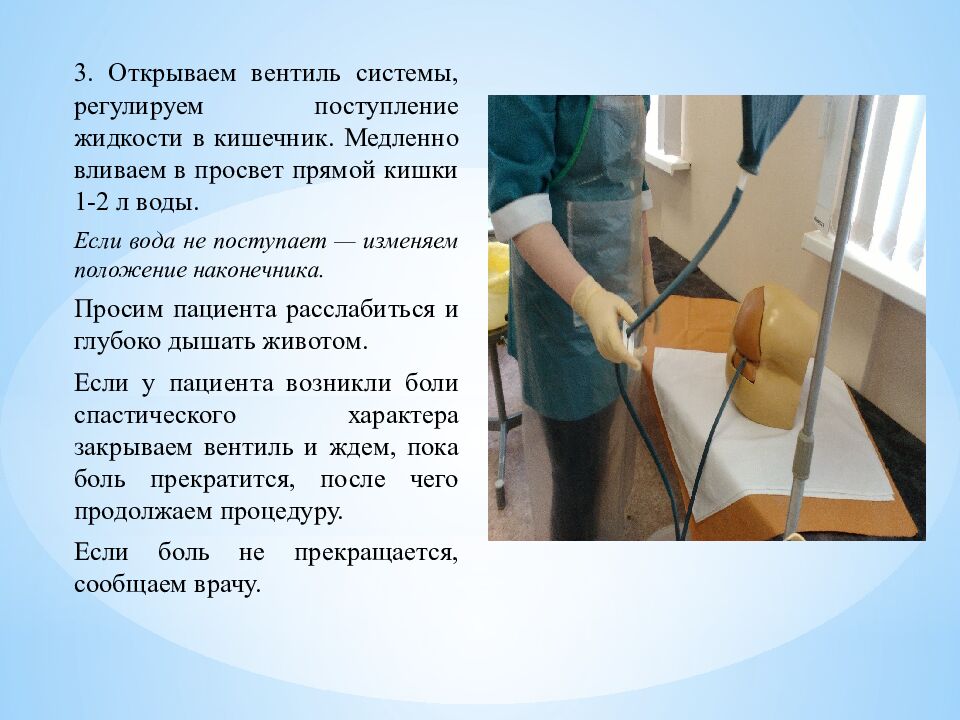 3. Открываем вентиль системы, регулируем поступление жидкости в кишечник. Медленно вливаем в просвет прямой кишки 1-2 л воды. Если вода не поступает — изменяем положение наконечника. Просим пациента расслабиться и глубоко дышать животом. Если у пациента возникли боли спастического характера закрываем вентиль и ждем, пока боль прекратится, после чего продолжаем процедуру. Если боль не прекращается, сообщаем врачу.