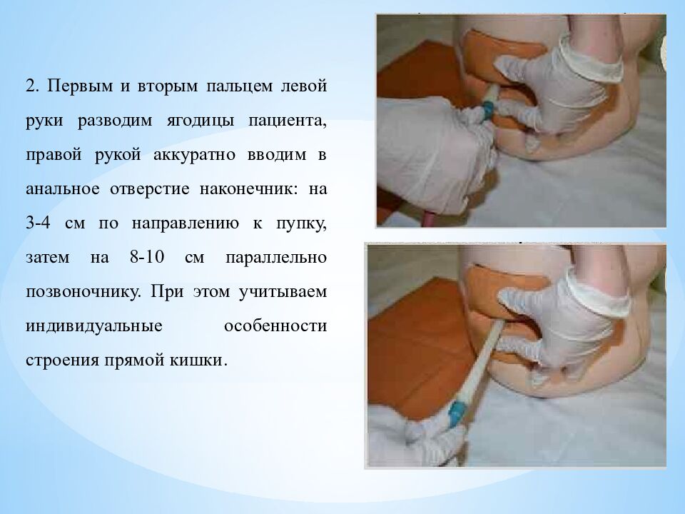 2. Первым и вторым пальцем левой руки разводим ягодицы пациента, правой рукой аккуратно вводим в анальное отверстие наконечник: на 3-4 см по направлению к пупку, затем на 8-10 см параллельно позвоночнику. При этом учитываем индивидуальные особенности строения прямой кишки.