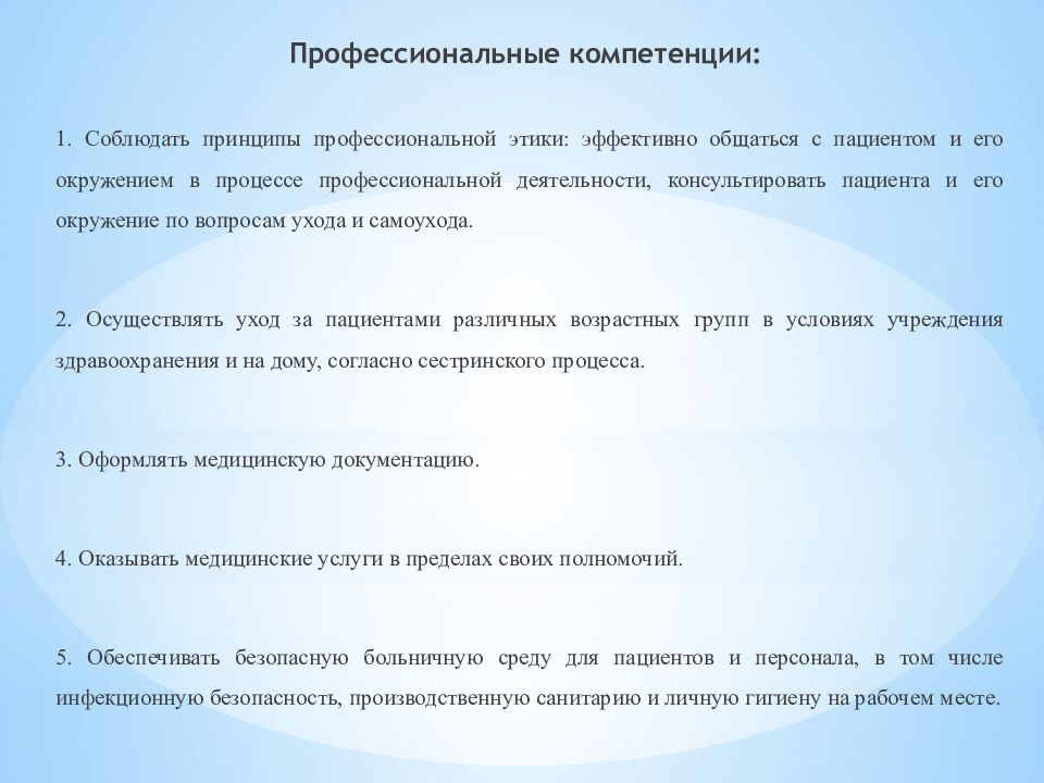 Профессиональные компетенции: 1. Соблюдать принципы профессиональной этики: эффективно общаться с пациентом и его окружением в процессе профессиональной деятельности, консультировать пациента и его окружение по вопросам ухода и самоухода. 2. Осуществлять уход за пациентами различных возрастных групп в условиях учреждения здравоохранения и на дому, согласно сестринского процесса. 3. Оформлять медицинскую документацию. 4. Оказывать медицинские услуги в пределах своих полномочий. 5. Обеспечивать безопасную больничную среду для пациентов и персонала, в том числе инфекционную безопасность, производственную санитарию и личную гигиену на рабочем месте.