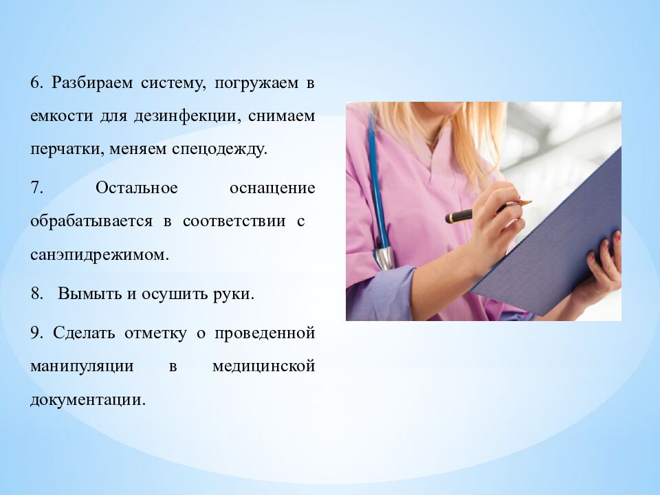 6. Разбираем систему, погружаем в емкости для дезинфекции, снимаем перчатки, меняем спецодежду. 7. Остальное оснащение обрабатывается в соответствии с санэпидрежимом. 8. Вымыть и осушить руки. 9. Сделать отметку о проведенной манипуляции в медицинской документации.