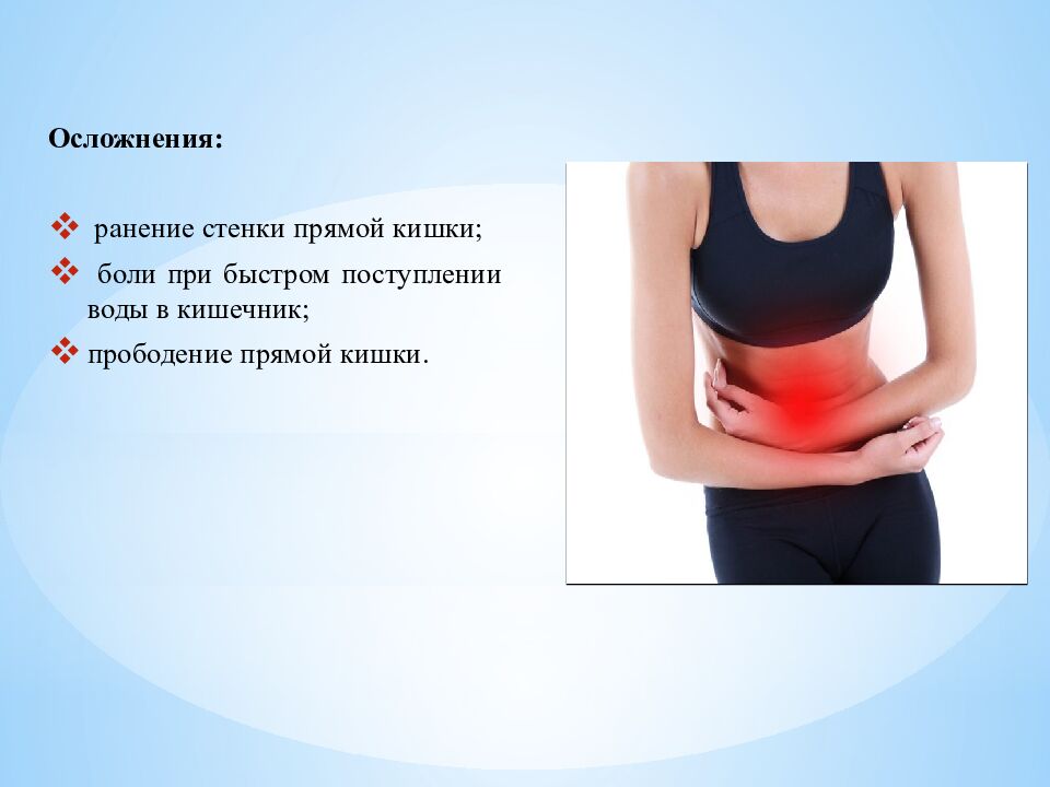 Осложнения: ранение стенки прямой кишки; боли при быстром поступлении воды в кишечник; п рободение прямой кишки.