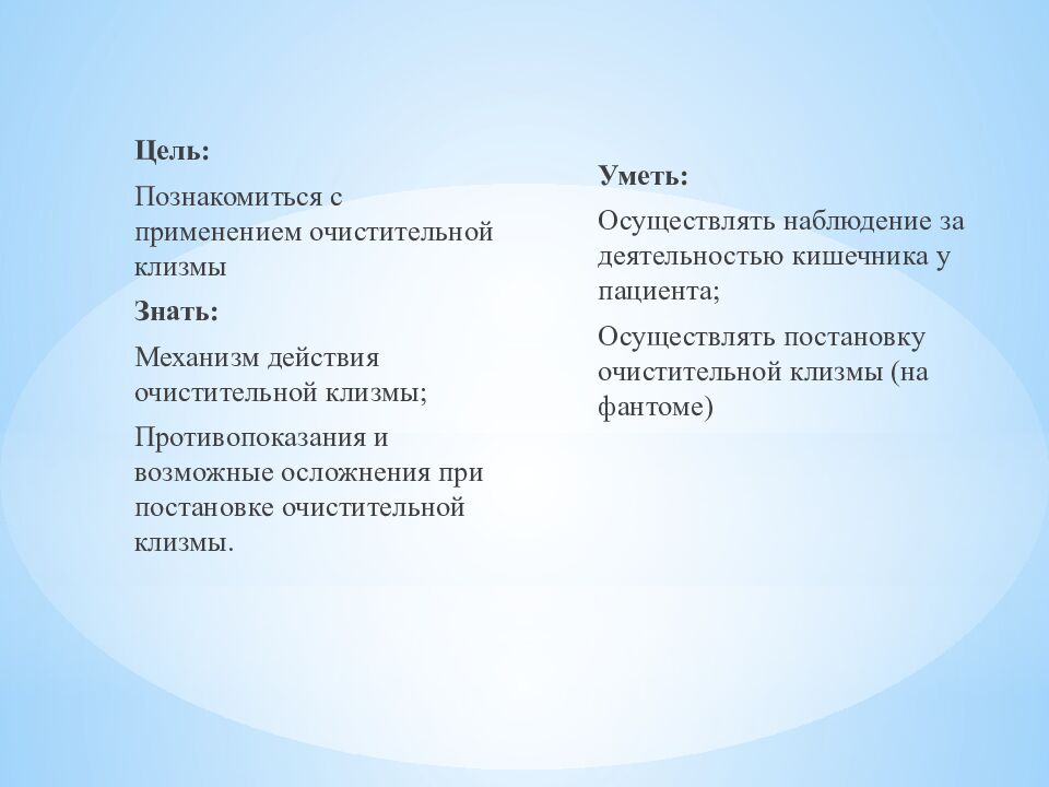 Уметь: Осуществлять наблюдение за деятельностью кишечника у пациента; Осуществлять постановку очистительной клизмы (на фантоме) Цель: Познакомиться с применением очистительной клизмы Знать: Механизм действия очистительной клизмы; Противопоказания и возможные осложнения при постановке очистительной клизмы.