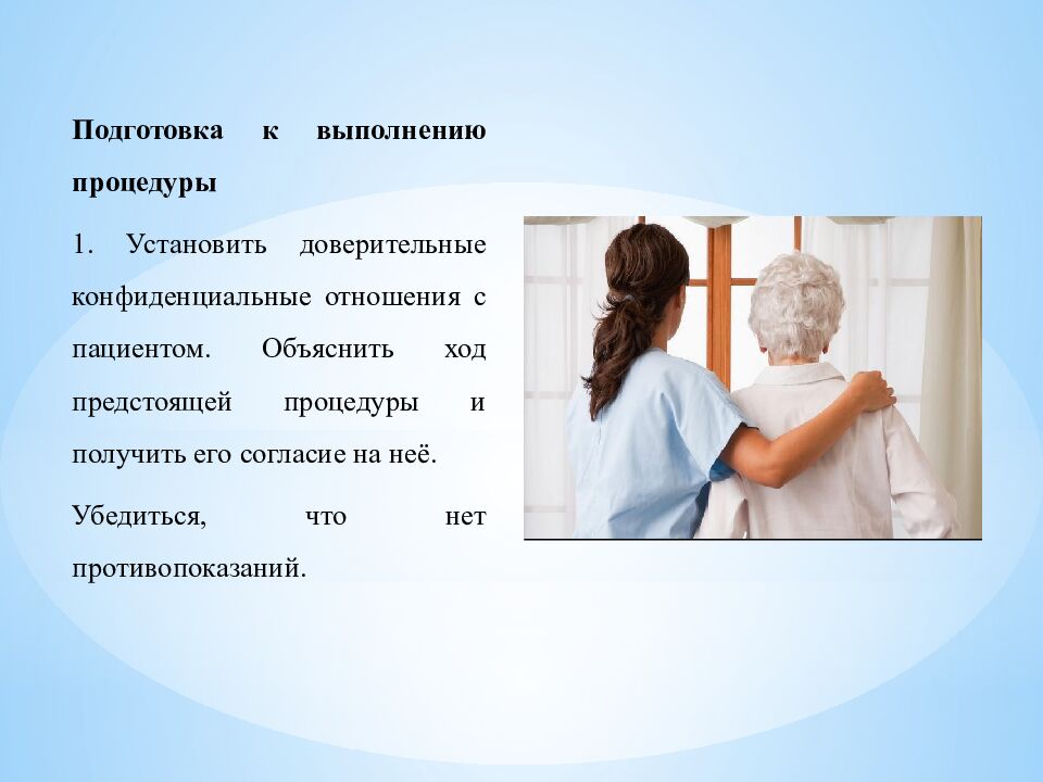 Подготовка к выполнению процедуры 1. Установить доверительные конфиденциальные отношения с пациентом. Объяснить ход предстоящей процедуры и получить его согласие на неё. Убедиться, что нет противопоказаний.