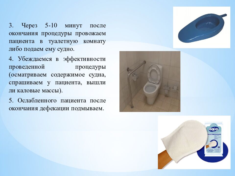 3. Через 5-10 минут после окончания процедуры провожаем пациента в туалетную комнату либо подаем ему судно. 4. Убеждаемся в эффективности проведенной процедуры (осматриваем содержимое судна, спрашиваем у пациента, вышли ли каловые массы). 5. Ослабленного пациента после окончания дефекации подмываем.