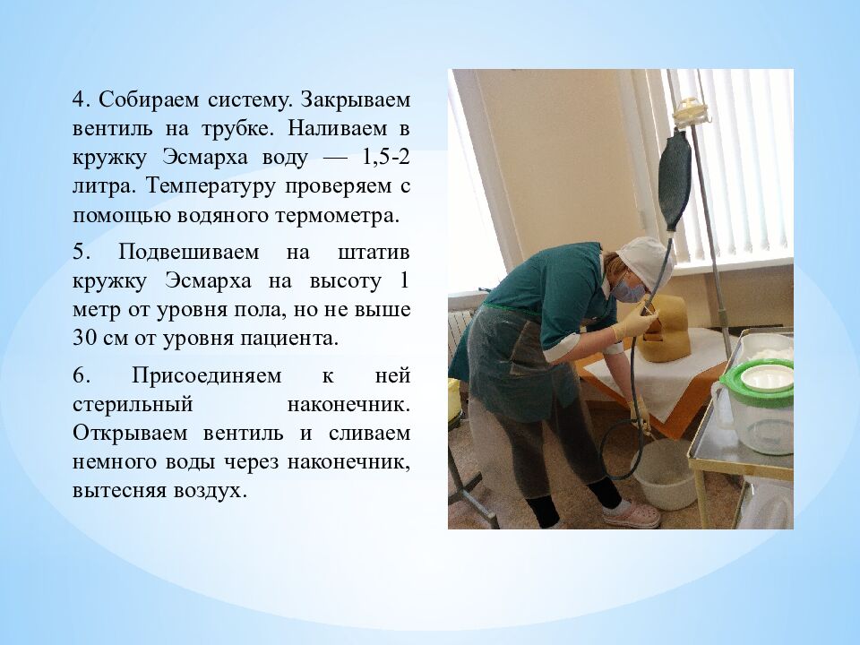 4. Собираем систему. Закрываем вентиль на трубке. Наливаем в кружку Эсмарха воду — 1,5-2 литра. Температуру проверяем с помощью водяного термометра. 5. Подвешиваем на штатив кружку Эсмарха на высоту 1 метр от уровня пола, но не выше 30 см от уровня пациента. 6. Присоединяем к ней стерильный наконечник. Открываем вентиль и сливаем немного воды через наконечник, вытесняя воздух.