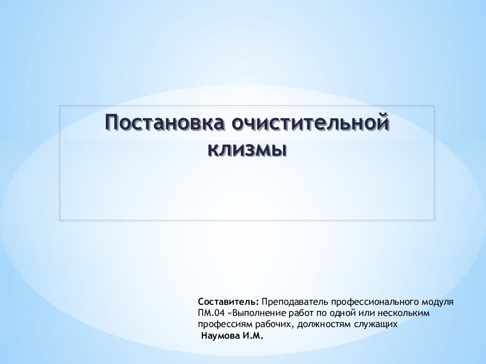 Постановка очистительной клизмы Составитель: Преподаватель профессионального модуля ПМ.04 « Выполнение работ по одной или нескольким профессиям рабочих, должностям служащих Наумова И.М.