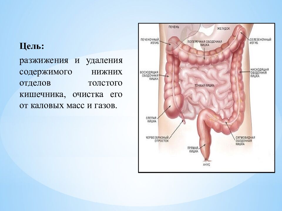 Цель: разжижения и удаления содержимого нижних отделов толстого кишечника, очистка его от каловых масс и газов.