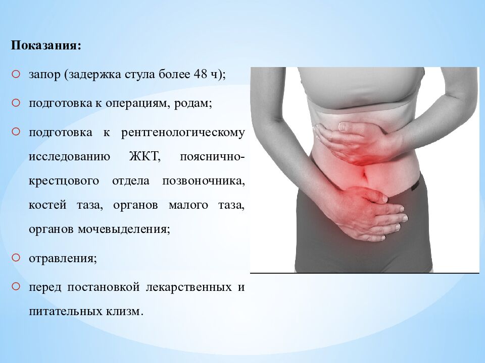 Показания: запор (задержка стула более 48 ч); подготовка к операциям, родам; подготовка к рентгенологическому исследованию ЖКТ, пояснично-крестцового отдела позвоночника, костей таза, органов малого таза, органов мочевыделения; отравления ; перед постановкой лекарственных и питательных клизм.