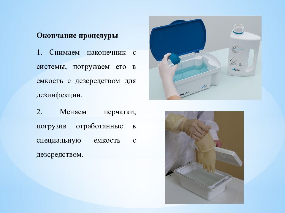 Окончание процедуры 1. Снимаем наконечник с системы, погружаем его в емкость с дезсредством для дезинфекции. 2. Меняем перчатки, погрузив отработанные в специальную емкость с дезсредством.