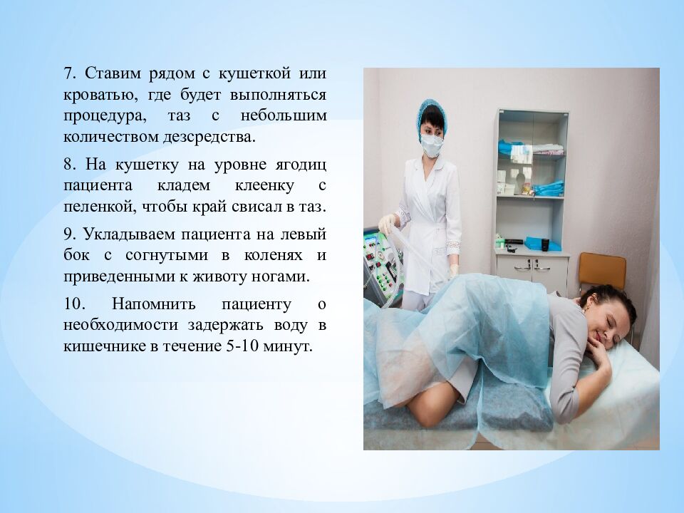 7. Ставим рядом с кушеткой или кроватью, где будет выполняться процедура, таз с небольшим количеством дезсредства. 8. На кушетку на уровне ягодиц пациента кладем клеенку с пеленкой, чтобы край свисал в таз. 9. Укладываем пациента на левый бок с согнутыми в коленях и приведенными к животу ногами. 10. Напомнить пациенту о необходимости задержать воду в кишечнике в течение 5-10 минут.