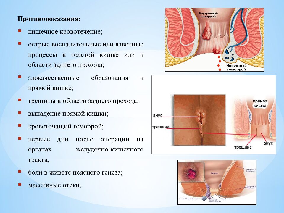 Противопоказания: кишечное кровотечение; острые воспалительные или язвенные процессы в толстой кишке или в области заднего прохода; злокачественные образования в прямой кишке; трещины в области заднего прохода; выпадение прямой кишки; кровоточащий геморрой; первые дни после операции на органах желудочно-кишечного тракта; боли в животе неясного генеза; массивные отеки.