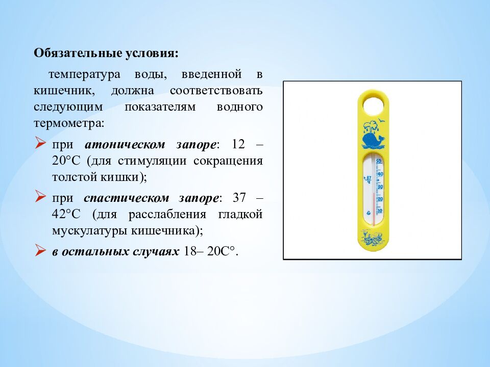Обязательные условия : температура воды, введенной в кишечник, должна соответствовать следующим показателям водного термометра: п ри атоническом запоре : 12 – 20°С (для стимуляции сокращения толстой кишки ); при спастическом запоре : 37 – 42°С (для расслабления гладкой мускулатуры кишечника); в остальных случаях 18– 20С °.