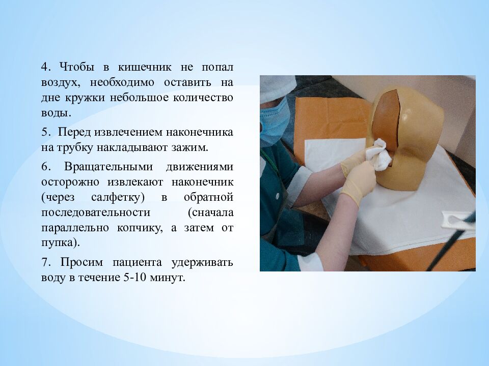 4. Чтобы в кишечник не попал воздух, необходимо оставить на дне кружки небольшое количество воды. 5. Перед извлечением наконечника на трубку накладывают зажим. 6. Вращательными движениями осторожно извлекают наконечник (через салфетку) в обратной последовательности (сначала параллельно копчику, а затем от пупка). 7. Просим пациента удерживать воду в течение 5-10 минут.
