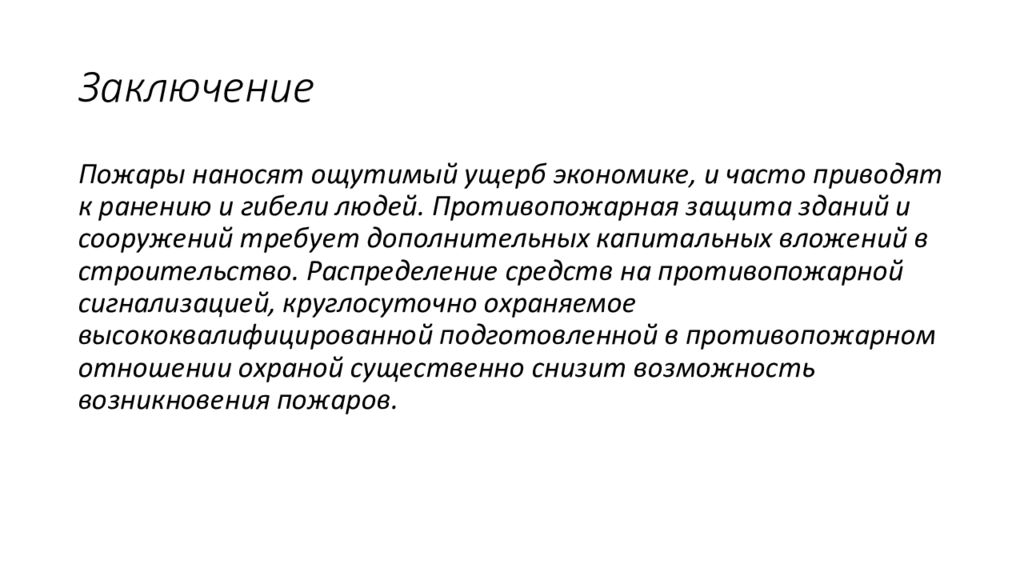 Пожары наносят ощутимый ущерб экономике, и часто приводят к ранению и гибели людей. Противопожарная защита зданий и сооружений требует дополнительных капитальных вложений в строительство. Распределение средств на противопожарной сигнализацией, круглосуточно охраняемое высококвалифицированной подготовленной в противопожарном отношении охраной существенно снизит возможность возникновения пожаров.