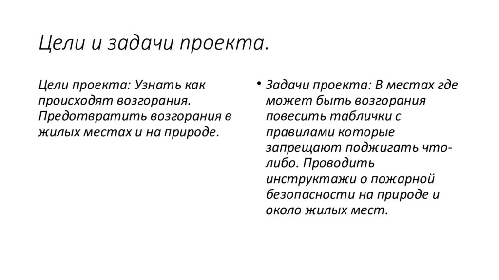 Цели проекта: Узнать как происходят возгорания. Предотвратить возгорания в жилых местах и на природе. Задачи проекта: В местах где может быть возгорания повесить таблички с правилами которые запрещают поджигать что-либо. Проводить инструктажи о пожарной безопасности на природе и около жилых мест.