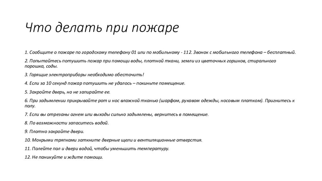 1. Сообщите о пожаре по городскому телефону 01 или по мобильному - 112. Звонок с мобильного телефона – бесплатный. 2. Попытайтесь потушить пожар при помощи воды, плотной ткани, земли из цветочных горшков, стирального порошка, соды. 3. Горящие электроприборы необходимо обесточить ! 4. Если за 10 секунд пожар потушить не удалось – покиньте помещение. 5. Закройте дверь, но не запирайте ее. 6. При задымлении прикрывайте рот и нос влажной тканью (шарфом, рукавом одежды, носовым платком). Пригнитесь к полу. 7. Если вы отрезаны огнем или выходы сильно задымлены, вернитесь в помещение. 8. По возможности запаситесь водой. 9. Плотно закройте двери. 10. Мокрыми тряпками заткните дверные щели и вентиляционные отверстия. 11. Полейте пол и двери водой, чтобы уменьшить температуру. 12. Не паникуйте и ждите помощи.