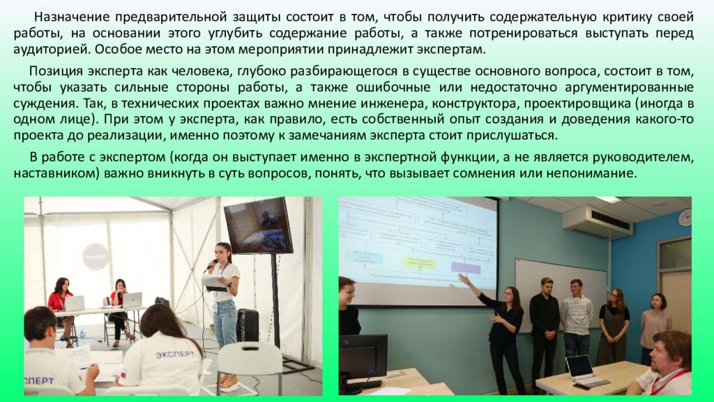 Назначение предварительной защиты состоит в том, чтобы получить содержательную критику своей работы, на основании этого углубить содержание работы, а также потренироваться выступать перед аудиторией. Особое место на этом мероприятии принадлежит экспертам. Позиция эксперта как человека, глубоко разбирающегося в существе основного вопроса, состоит в том, чтобы указать сильные стороны работы, а также ошибочные или недостаточно аргументированные суждения. Так, в технических проектах важно мнение инженера, конструктора, проектировщика (иногда в одном лице). При этом у эксперта, как правило, есть собственный опыт создания и доведения какого-то проекта до реализации, именно поэтому к замечаниям эксперта стоит прислушаться. В работе с экспертом (когда он выступает именно в экспертной функции, а не является руководителем, наставником) важно вникнуть в суть вопросов, понять, что вызывает сомнения или непонимание.