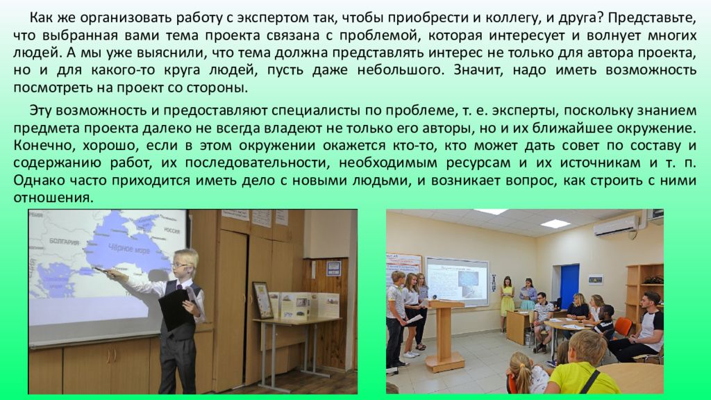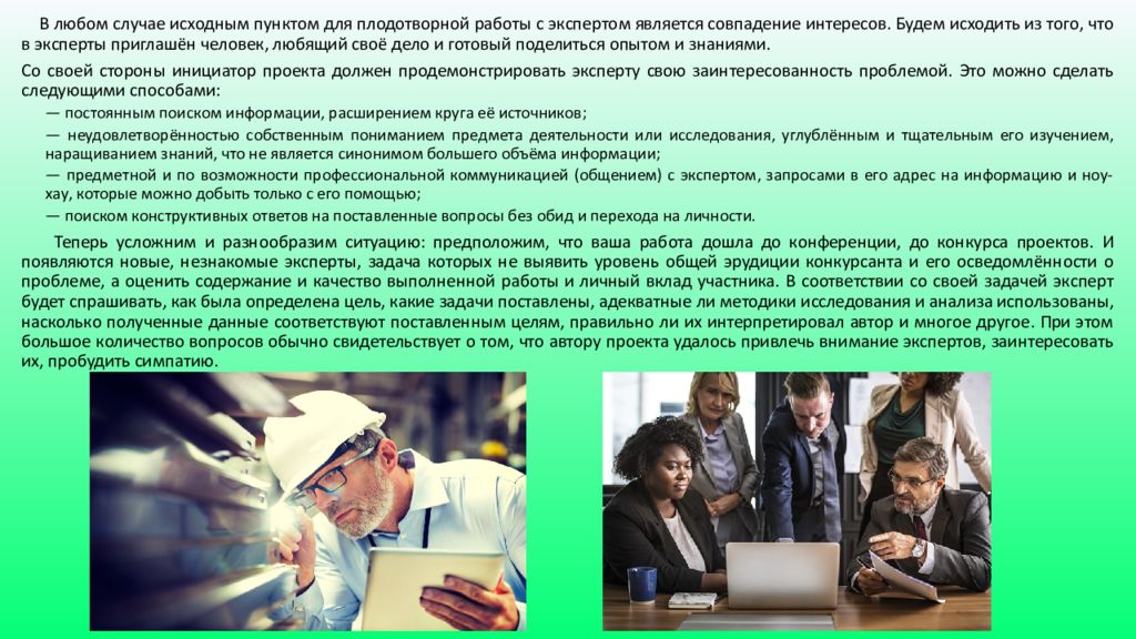 В любом случае исходным пунктом для плодотворной работы с экспертом является совпадение интересов. Будем исходить из того, что в эксперты приглашён человек, любящий своё дело и готовый поделиться опытом и знаниями. Со своей стороны инициатор проекта должен продемонстрировать эксперту свою заинтересованность проблемой. Это можно сделать следующими способами: — постоянным поиском информации, расширением круга её источников; — неудовлетворённостью собственным пониманием предмета деятельности или исследования, углублённым и тщательным его изучением, наращиванием знаний, что не является синонимом большего объёма информации; — предметной и по возможности профессиональной коммуникацией (общением) с экспертом, запросами в его адрес на информацию и ноу-хау, которые можно добыть только с его помощью; — поиском конструктивных ответов на поставленные вопросы без обид и перехода на личности. Теперь усложним и разнообразим ситуацию: предположим, что ваша работа дошла до конференции, до конкурса проектов. И появляются новые, незнакомые эксперты, задача которых не выявить уровень общей эрудиции конкурсанта и его осведомлённости о проблеме, а оценить содержание и качество выполненной работы и личный вклад участника. В соответствии со своей задачей эксперт будет спрашивать, как была определена цель, какие задачи поставлены, адекватные ли методики исследования и анализа использованы, насколько полученные данные соответствуют поставленным целям, правильно ли их интерпретировал автор и многое другое. При этом большое количество вопросов обычно свидетельствует о том, что автору проекта удалось привлечь внимание экспертов, заинтересовать их, пробудить симпатию.