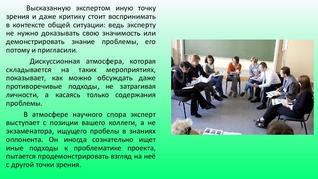 Высказанную экспертом иную точку зрения и даже критику стоит воспринимать в контексте общей ситуации: ведь эксперту не нужно доказывать свою значимость или демонстрировать знание проблемы, его потому и пригласили. Дискуссионная атмосфера, которая складывается на таких мероприятиях, показывает, как можно обсуждать даже противоречивые подходы, не затрагивая личности, а касаясь только содержания проблемы. В атмосфере научного спора эксперт выступает с позиции вашего коллеги, а не экзаменатора, ищущего пробелы в знаниях оппонента. Он иногда сознательно ищет иные подходы к проблематике проекта, пытается продемонстрировать взгляд на неё с другой точки зрения.