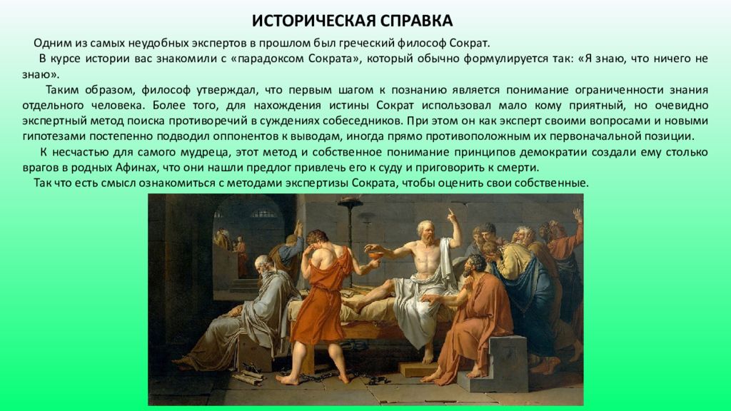 ИСТОРИЧЕСКАЯ СПРАВКА Одним из самых неудобных экспертов в прошлом был греческий философ Сократ. В курсе истории вас знакомили с «парадоксом Сократа», который обычно формулируется так: «Я знаю, что ничего не знаю». Таким образом, философ утверждал, что первым шагом к познанию является понимание ограниченности знания отдельного человека. Более того, для нахождения истины Сократ использовал мало кому приятный, но очевидно экспертный метод поиска противоречий в суждениях собеседников. При этом он как эксперт своими вопросами и новыми гипотезами постепенно подводил оппонентов к выводам, иногда прямо противоположным их первоначальной позиции. К несчастью для самого мудреца, этот метод и собственное понимание принципов демократии создали ему столько врагов в родных Афинах, что они нашли предлог привлечь его к суду и приговорить к смерти. Так что есть смысл ознакомиться с методами экспертизы Сократа, чтобы оценить свои собственные.