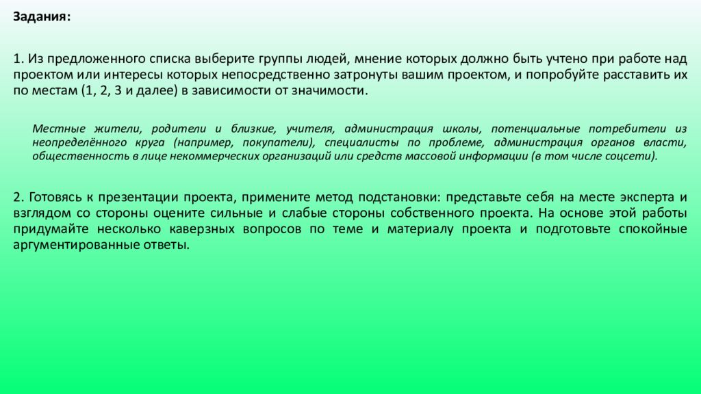 Задания : 1. Из предложенного списка выберите группы людей, мнение которых должно быть учтено при работе над проектом или интересы которых непосредственно затронуты вашим проектом, и попробуйте расставить их по местам (1, 2, 3 и далее) в зависимости от значимости. Местные жители, родители и близкие, учителя, администрация школы, потенциальные потребители из неопределённого круга (например, покупатели), специалисты по проблеме, администрация органов власти, общественность в лице некоммерческих организаций или средств массовой информации (в том числе соцсети). 2. Готовясь к презентации проекта, примените метод подстановки: представьте себя на месте эксперта и взглядом со стороны оцените сильные и слабые стороны собственного проекта. На основе этой работы придумайте несколько каверзных вопросов по теме и материалу проекта и подготовьте спокойные аргументированные ответы.