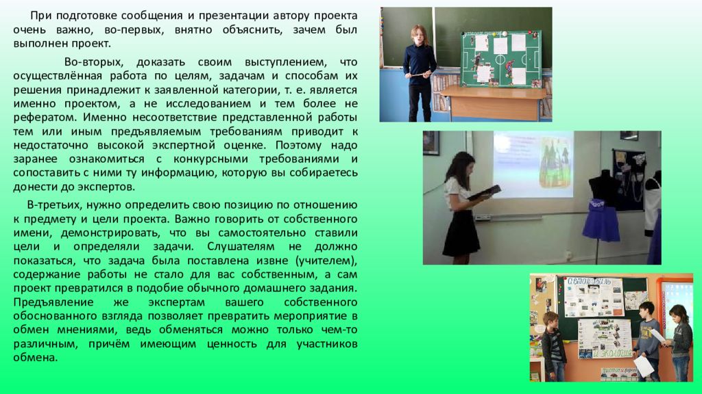 При подготовке сообщения и презентации автору проекта очень важно, во-первых, внятно объяснить, зачем был выполнен проект. Во-вторых, доказать своим выступлением, что осуществлённая работа по целям, задачам и способам их решения принадлежит к заявленной категории, т. е. является именно проектом, а не исследованием и тем более не рефератом. Именно несоответствие представленной работы тем или иным предъявляемым требованиям приводит к недостаточно высокой экспертной оценке. Поэтому надо заранее ознакомиться с конкурсными требованиями и сопоставить с ними ту информацию, которую вы собираетесь донести до экспертов. В-третьих, нужно определить свою позицию по отношению к предмету и цели проекта. Важно говорить от собственного имени, демонстрировать, что вы самостоятельно ставили цели и определяли задачи. Слушателям не должно показаться, что задача была поставлена извне (учителем), содержание работы не стало для вас собственным, а сам проект превратился в подобие обычного домашнего задания. Предъявление же экспертам вашего собственного обоснованного взгляда позволяет превратить мероприятие в обмен мнениями, ведь обменяться можно только чем-то различным, причём имеющим ценность для участников обмена.