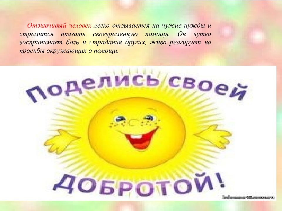 Отзывчивый человек легко отзывается на чужие нужды и стремится оказать своевременную помощь. Он чутко воспринимает боль и страдания других, живо реагирует на просьбы окружающих о помощи.