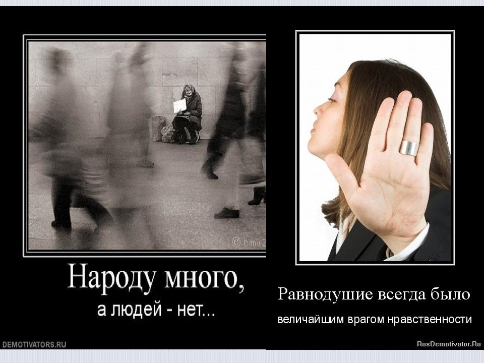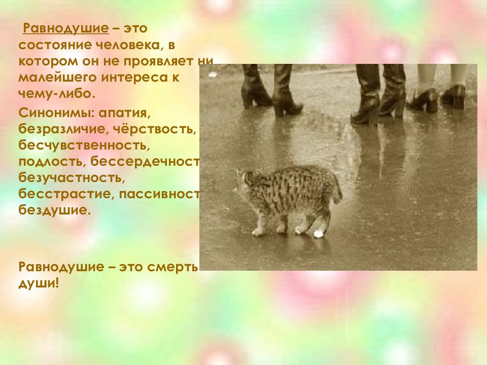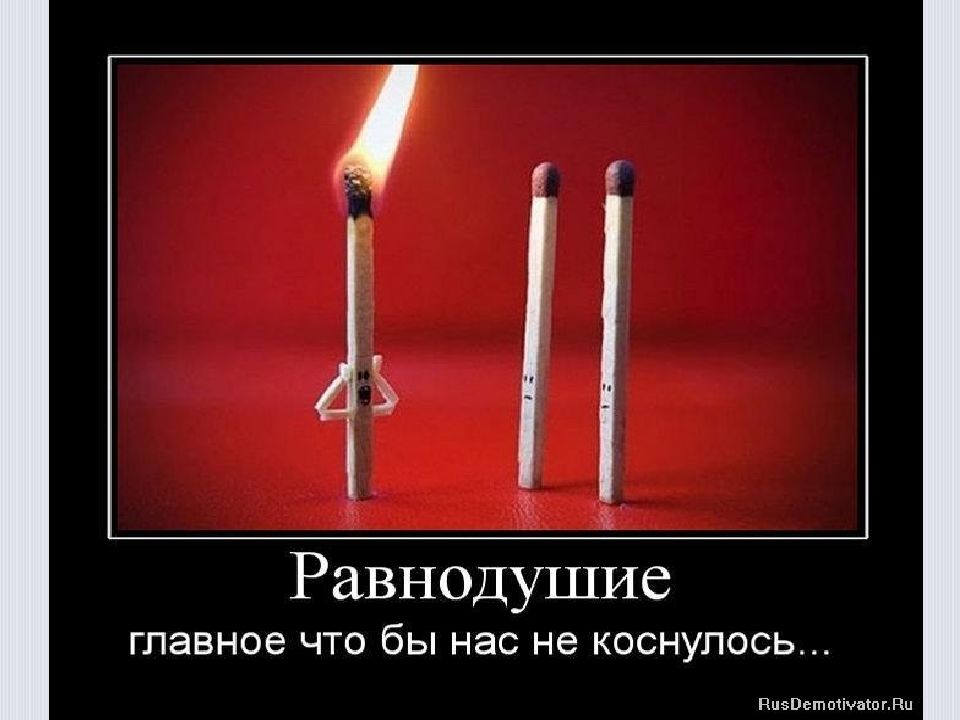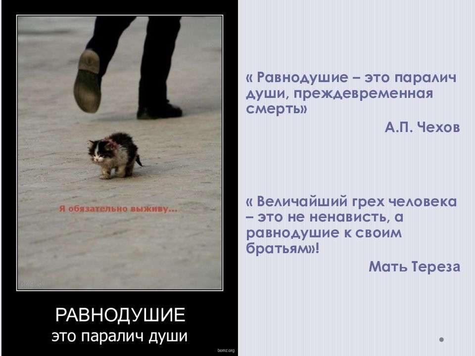 Равнодушие – это состояние человека, в котором он не проявляет ни малейшего интереса к чему-либо. Синонимы: апатия, безразличие, чёрствость, бесчувственность, подлость, бессердечность, безучастность, бесстрастие, пассивность, бездушие. Равнодушие – это смерть души!
