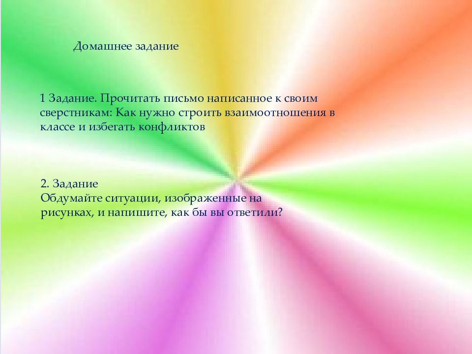 Домашнее задание 1 Задание. Прочитать письмо написанное к своим сверстникам: Как нужно строить взаимоотношения в классе и избегать конфликтов 2. Задание Обдумайте ситуации, изображенные на рисунках, и напишите, как бы вы ответили?