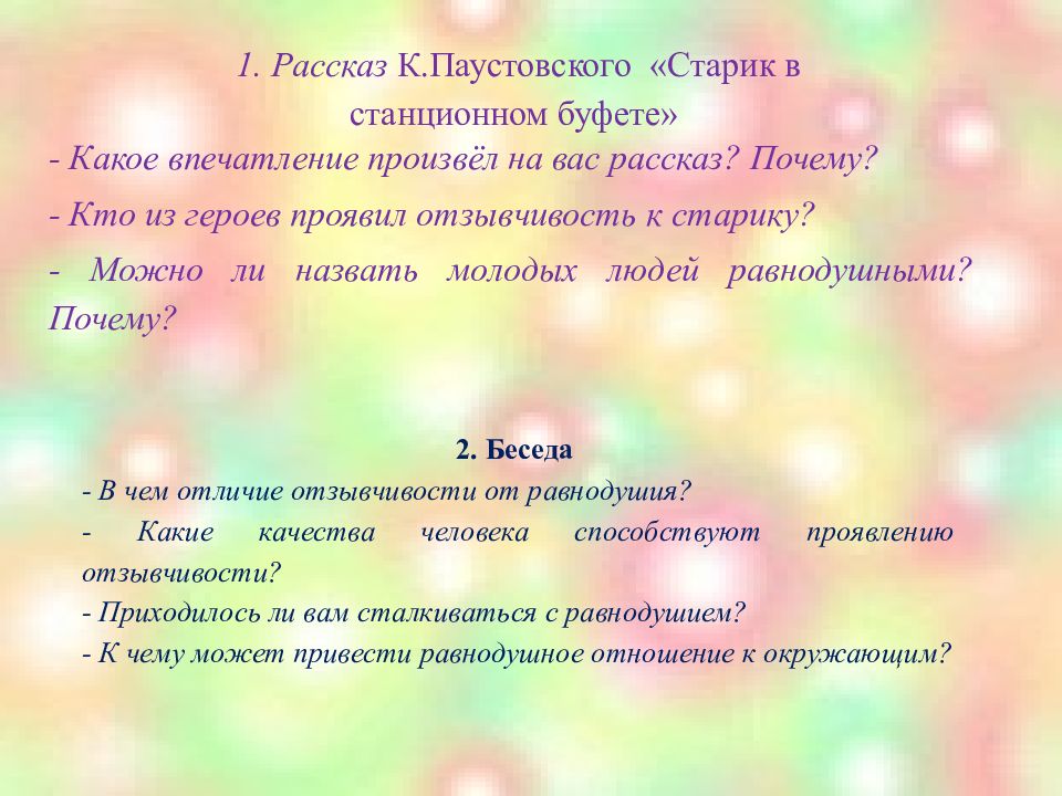 - Какое впечатление произвёл на вас рассказ? Почему? - Кто из героев проявил отзывчивость к старику? - Можно ли назвать молодых людей равнодушными? Почему? 2. Беседа - В чем отличие отзывчивости от равнодушия? - Какие качества человека способствуют проявлению отзывчивости? - Приходилось ли вам сталкиваться с равнодушием? - К чему может привести равнодушное отношение к окружающим? 1. Рассказ К.Паустовского «Старик в станционном буфете»