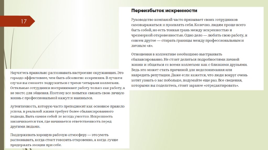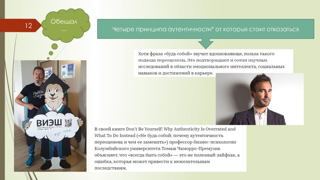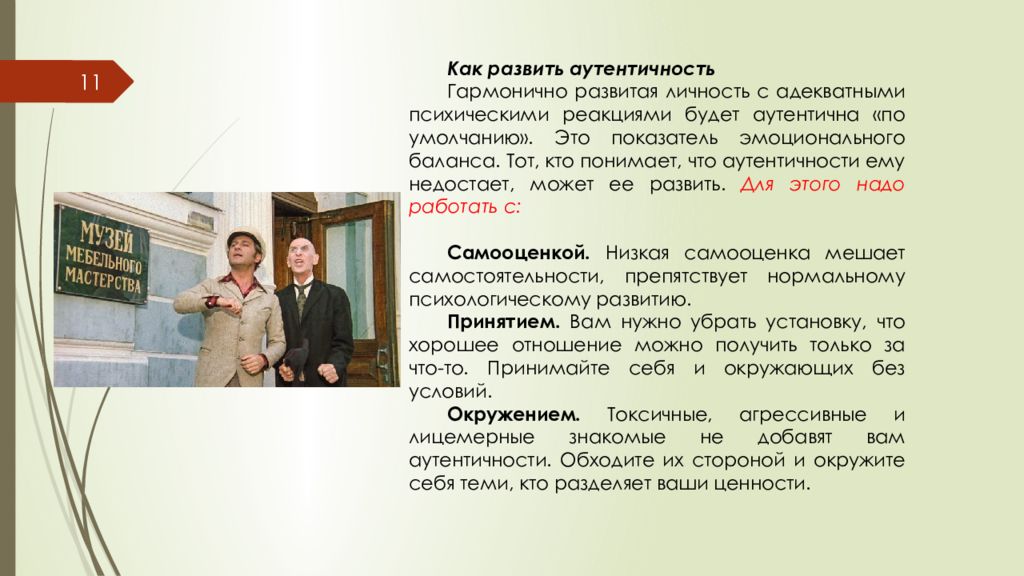 11 Как развить аутентичность Гармонично развитая личность с адекватными психическими реакциями будет аутентична «по умолчанию». Это показатель эмоционального баланса. Тот, кто понимает, что аутентичности ему недостает, может ее развить. Для этого надо работать с: Самооценкой. Низкая самооценка мешает самостоятельности, препятствует нормальному психологическому развитию. Принятием. Вам нужно убрать установку, что хорошее отношение можно получить только за что-то. Принимайте себя и окружающих без условий. Окружением. Токсичные, агрессивные и лицемерные знакомые не добавят вам аутентичности. Обходите их стороной и окружите себя теми, кто разделяет ваши ценности.