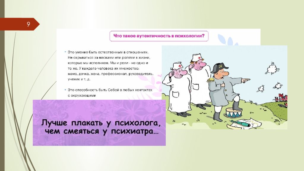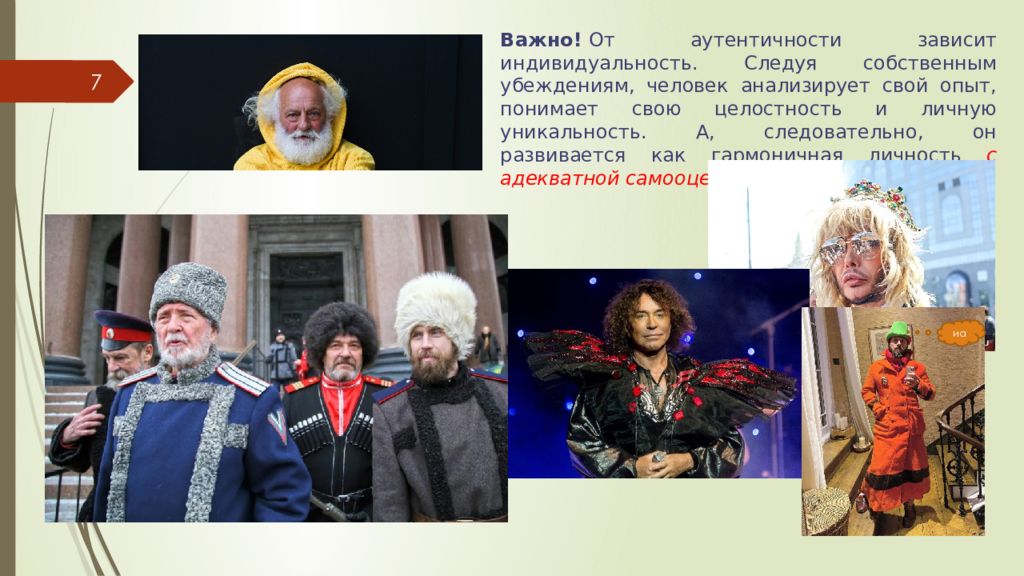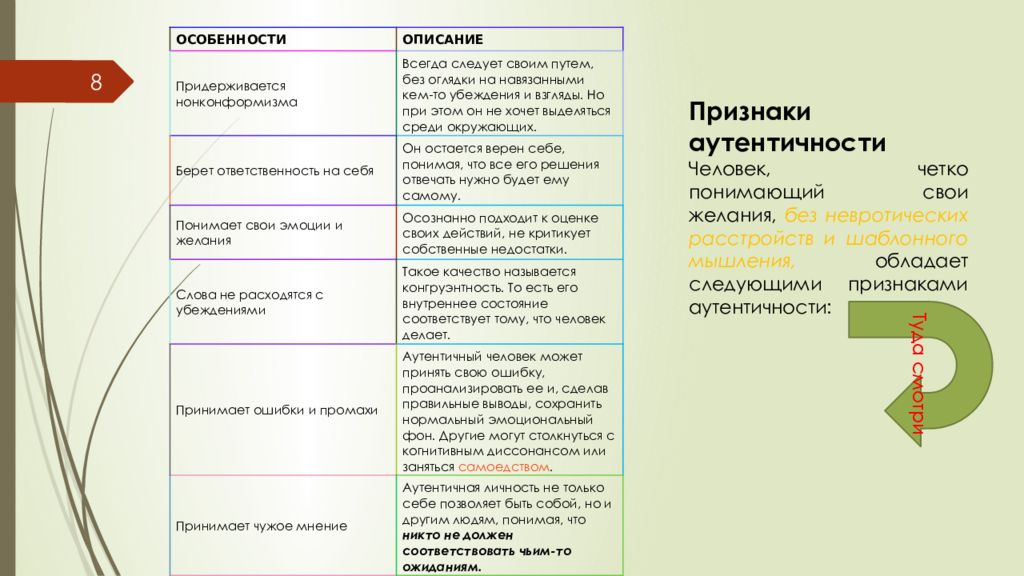 7 Важно! От аутентичности зависит индивидуальность. Следуя собственным убеждениям, человек анализирует свой опыт, понимает свою целостность и личную уникальность. А, следовательно, он развивается как гармоничная личность с адекватной самооценкой. иа