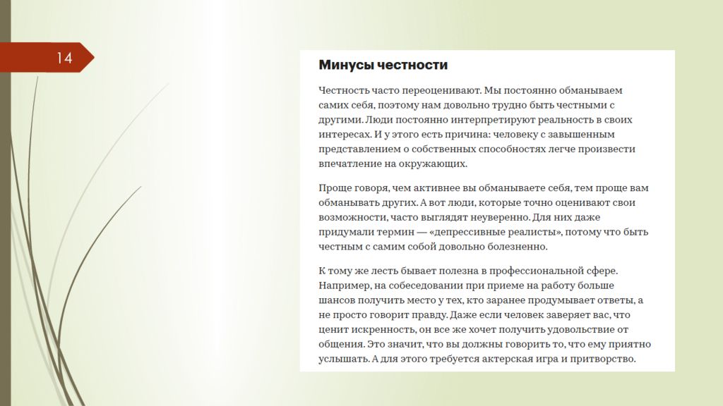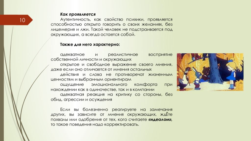 10 Как проявляется Аутентичность, как свойство психики, проявляется способностью открыто говорить о своих желаниях, без лицемерия и лжи. Такой человек не подстраивается под окружающих, а всегда остается собой. Также для него характерно: адекватное и реалистичное восприятие собственной личности и окружающих открытое и свободное выражение своего мнения, даже если оно отличается от мнения остальных действия и слова не противоречат жизненным ценностям и выбранным ориентирам ощущение эмоционального комфорта при нахождении как в одиночестве, так и в компании адекватная реакция на критику со стороны, без обид, агрессии и осуждения Если вы болезненно реагируете на замечания других, вы зависите от мнения окружающих, ждЁте похвалы или одобрения от тех, кого считаете «идеалом», то такое поведения надо корректировать.