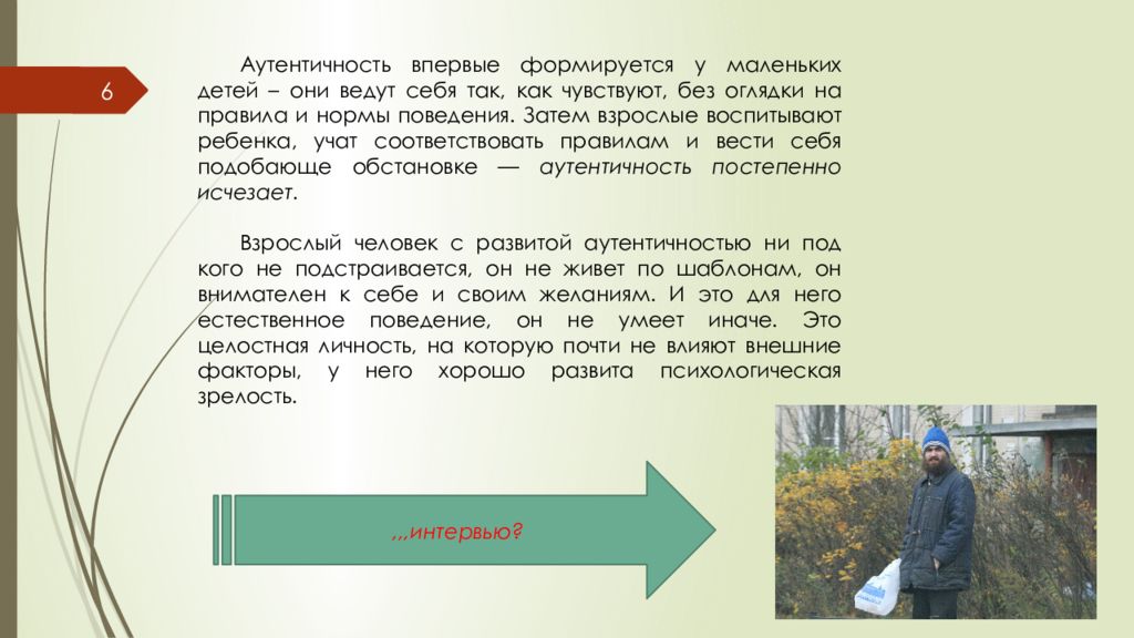 6 Аутентичность впервые формируется у маленьких детей – они ведут себя так, как чувствуют, без оглядки на правила и нормы поведения. Затем взрослые воспитывают ребенка, учат соответствовать правилам и вести себя подобающе обстановке — аутентичность постепенно исчезает. Взрослый человек с развитой аутентичностью ни под кого не подстраивается, он не живет по шаблонам, он внимателен к себе и своим желаниям. И это для него естественное поведение, он не умеет иначе. Это целостная личность, на которую почти не влияют внешние факторы, у него хорошо развита психологическая зрелость. ,,,интервью?