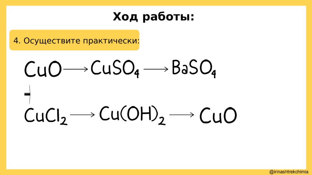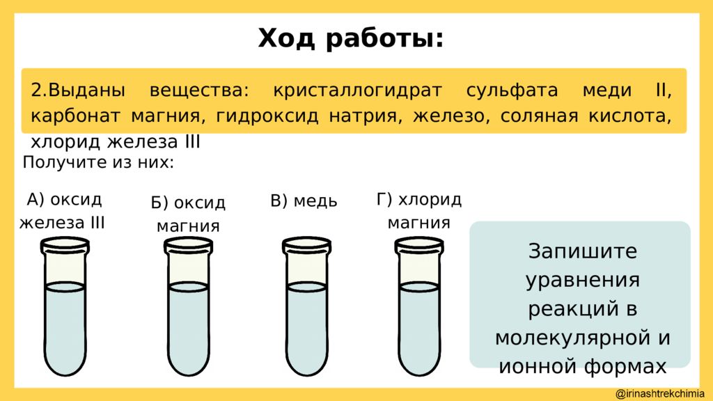 Ход работы: 2.Выданы вещества: кристаллогидрат сульфата меди II, карбонат магния, гидроксид натрия, железо, соляная кислота, хлорид железа III Получите из них: А) оксид железа III Б) оксид магния В) медь Г) хлорид магния Запишите уравнения реакций в молекулярной и ионной формах