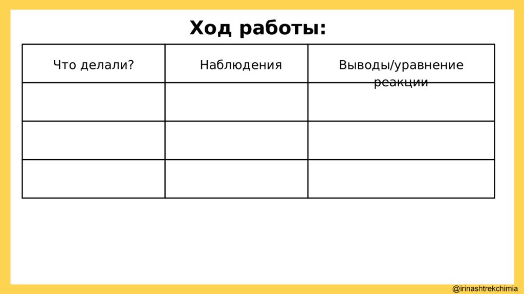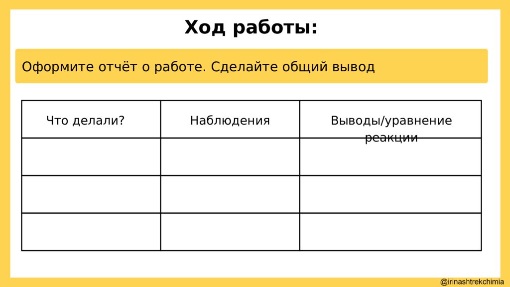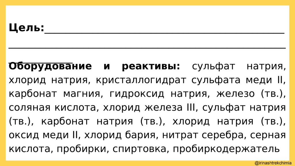Цель: _____________________________________________________________________________________________________________ Оборудование и реактивы: сульфат натрия, хлорид натрия, кристаллогидрат сульфата меди II, карбонат магния, гидроксид натрия, железо (тв.), соляная кислота, хлорид железа III, сульфат натрия (тв.), карбонат натрия (тв.), хлорид натрия (тв.), оксид меди II, хлорид бария, нитрат серебра, серная кислота, пробирки, спиртовка, пробиркодержатель