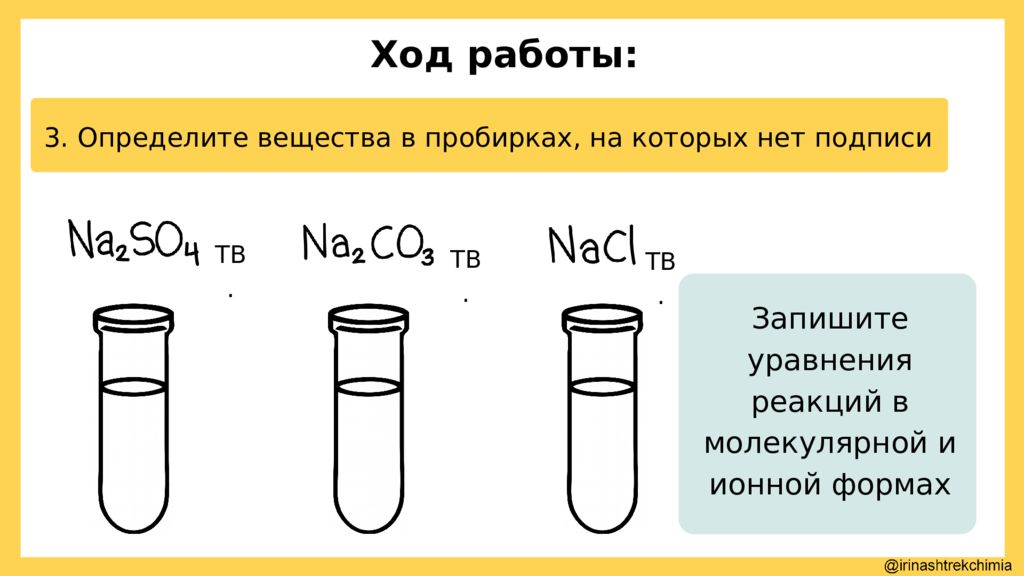 Запишите уравнения реакций в молекулярной и ионной формах Ход работы: 3. Определите вещества в пробирках, на которых нет подписи ТВ. ТВ. ТВ.