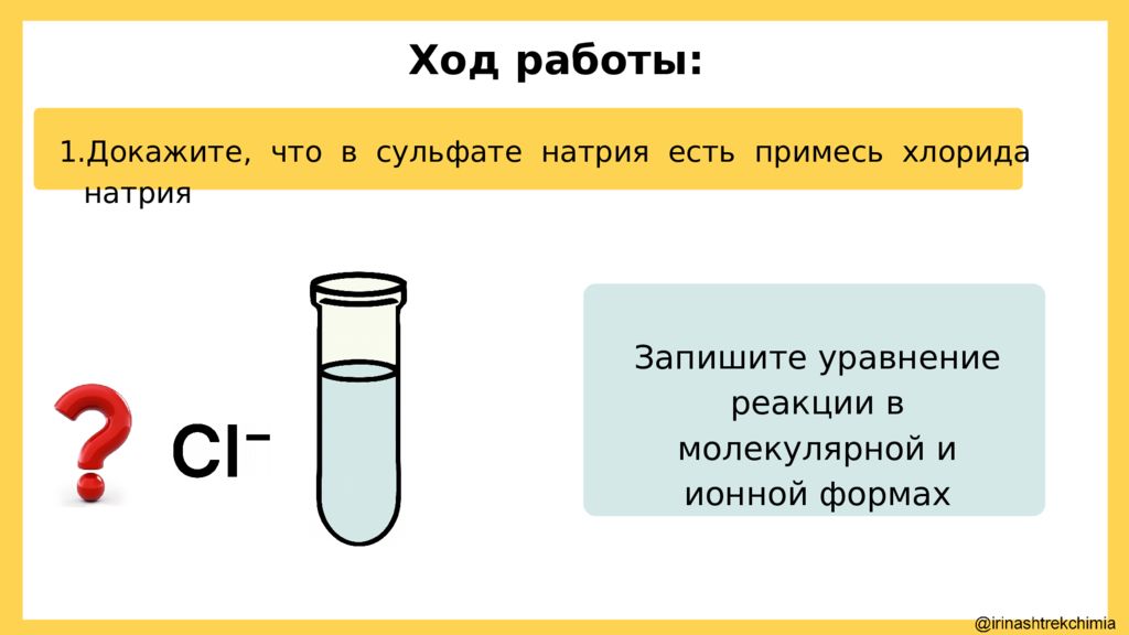 Ход работы: Докажите, что в сульфате натрия есть примесь хлорида натрия Запишите уравнение реакции в молекулярной и ионной формах