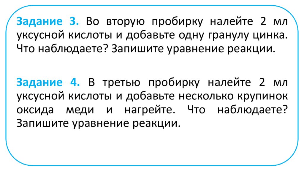 Задание 3. Во вторую пробирку налейте 2 мл уксусной кислоты и добавьте одну гранулу цинка. Что наблюдаете? Запишите уравнение реакции. Задание 4. В третью пробирку налейте 2 мл уксусной кислоты и добавьте несколько крупинок оксида меди и нагрейте. Что наблюдаете? Запишите уравнение реакции.