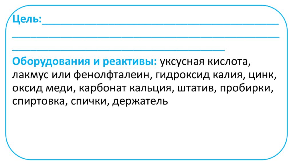 Цель: ______________________________________________________________________________________________________________________ Оборудования и реактивы: уксусная кислота, лакмус или фенолфталеин, гидроксид калия, цинк, оксид меди, карбонат кальция, штатив, пробирки, спиртовка, спички, держатель