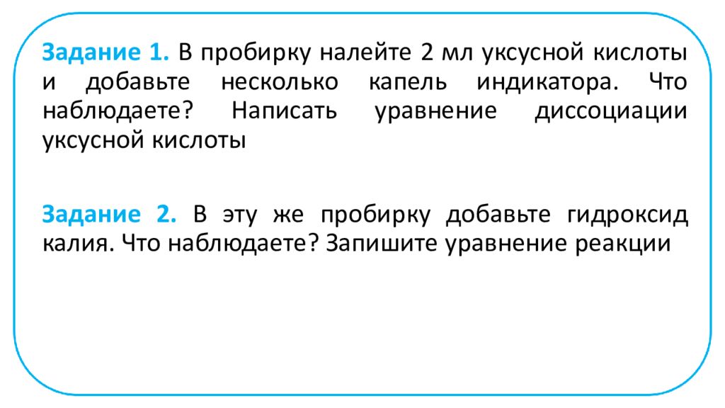 Задание 1. В пробирку налейте 2 мл уксусной кислоты и добавьте несколько капель индикатора. Что наблюдаете? Написать уравнение диссоциации уксусной кислоты Задание 2. В эту же пробирку добавьте гидроксид калия. Что наблюдаете? Запишите уравнение реакции