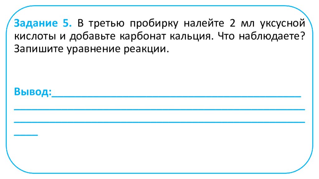 Задание 5. В третью пробирку налейте 2 мл уксусной кислоты и добавьте карбонат кальция. Что наблюдаете? Запишите уравнение реакции. Вывод:________________________________________________________________________________________________________________________________________________