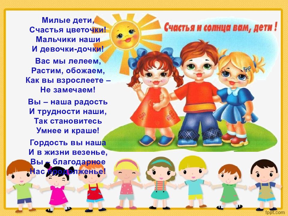 Милые дети, Счастья цветочки! Мальчики наши И девочки-дочки! Вас мы лелеем, Растим, обожаем, Как вы взрослеете – Не замечаем! Вы – наша радость И трудности наши, Так становитесь Умнее и краше! Гордость вы наша И в жизни везенье, Вы – благодарное Нас продолженье!