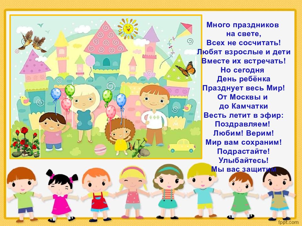 Много праздников на свете, Всех не сосчитать! Любят взрослые и дети Вместе их встречать! Но сегодня День ребёнка Празднует весь Мир! От Москвы и до Камчатки Весть летит в эфир: Поздравляем! Любим! Верим! Мир вам сохраним! Подрастайте! Улыбайтесь! Мы вас защитим