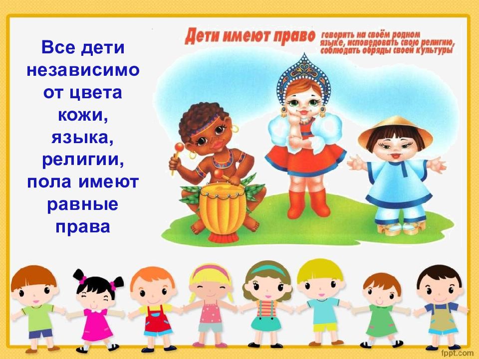 Слайд 20: Все дети независимо от цвета кожи, языка, религии, пола имеют равные права