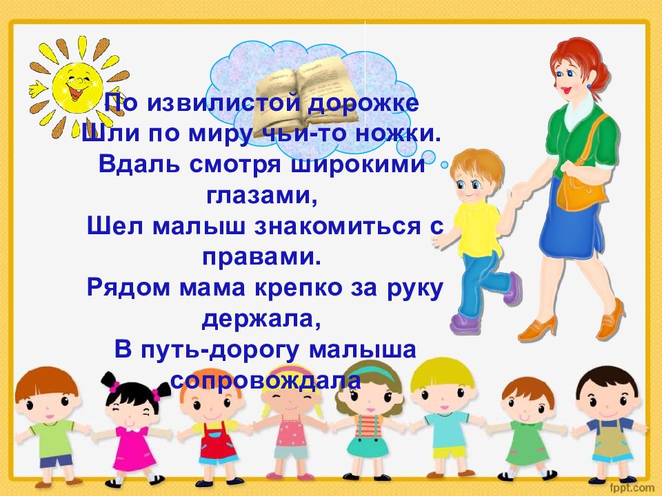 По извилистой дорожке Шли по миру чьи-то ножки. Вдаль смотря широкими глазами, Шел малыш знакомиться с правами. Рядом мама крепко за руку держала, В путь-дорогу малыша сопровождала