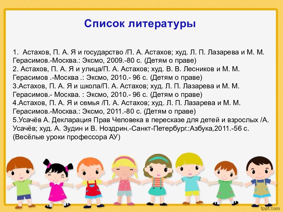 Список литературы 1. Астахов, П. А. Я и государство /П. А. Астахов; худ. Л. П. Лазарева и М. М. Герасимов.-Москва.: Эксмо, 2009.-80 с. (Детям о праве) 2. Астахов, П. А. Я и улица/П. А. Астахов; худ. В. В. Лесников и М. М. Герасимов.-Москва.: Эксмо, 2010.- 96 с. (Детям о праве) 3.Астахов, П. А. Я и школа/П. А. Астахов; худ. Л. П. Лазарева и М. М. Герасимов.- Москва. : Эксмо, 2010.- 96 с. (Детям о праве) 4.Астахов, П. А. Я и семья /П. А. Астахов; худ. Л. П. Лазарева и М. М. Герасимов.-Москва.: Эксмо, 2011.-80 с. (Детям о праве) 5.Усачёв А. Декларация Прав Человека в пересказе для детей и взрослых /А. Усачёв; худ. А. Зудин и В. Ноздрин.-Санкт-Петербург.:Азбука,2011.-56 с. (Весёлые уроки профессора АУ)