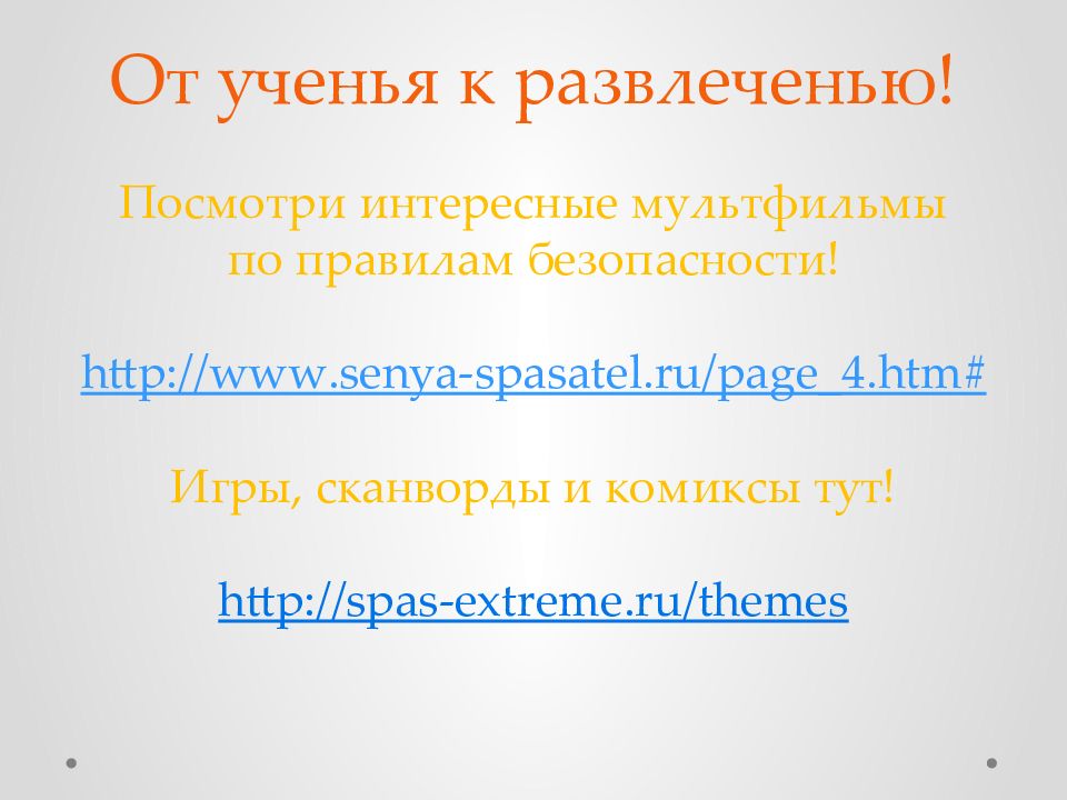 Посмотри интересные мультфильмы по правилам безопасности! http://www.senya-spasatel.ru/page_4.htm # Игры, сканворды и комиксы тут! http://spas-extreme.ru/themes