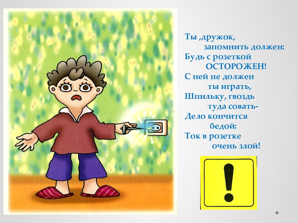 Ты,дружок, запомнить должен: Будь с розеткой ОСТОРОЖЕН! С ней не должен ты играть, Шпильку, гвоздь туда совать- Дело кончится бедой: Ток в розетке очень злой!