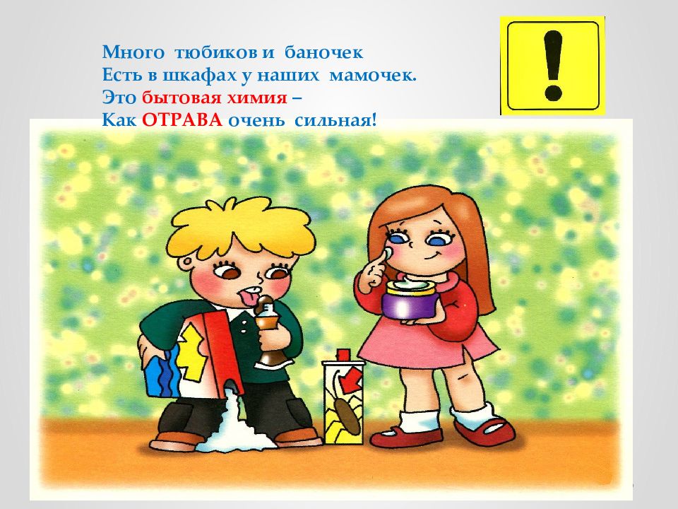 Много тюбиков и баночек Есть в шкафах у наших мамочек. Это бытовая химия – Как ОТРАВА очень сильная!